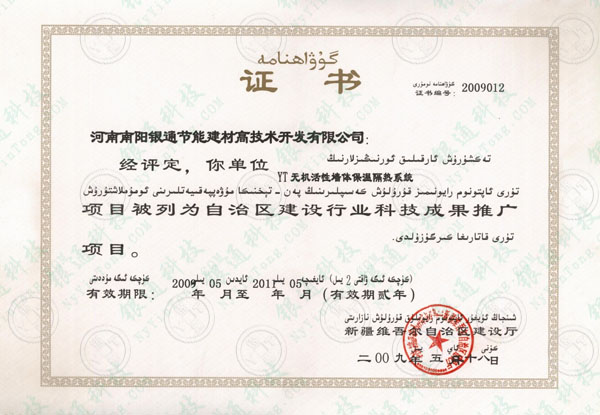 河南南陽銀通節能建材高技術開發有限公司:經評定,你單位YT無機活性墻體保溫隔熱系統項目被列為自治區建設行業科技成果推廣項目。有效期兩年。 新疆維吾爾自治區建設廳。