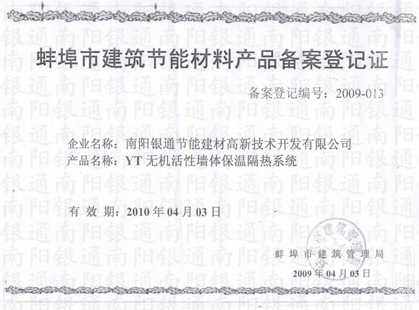 蚌埠市建筑節(jié)能材料產(chǎn)品備案登記證
