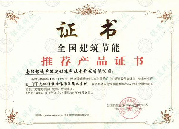 新材節(jié)能推字【2013】077號:經(jīng)全國新型建筑材料科技推廣中心評審委員會評審,你單位生產(chǎn)的YT無機活性墻體保溫隔熱系統(tǒng)被評為全國建筑節(jié)能推薦產(chǎn)品,特向全國建筑工程和廣大消費推廣使用,特頒此證。