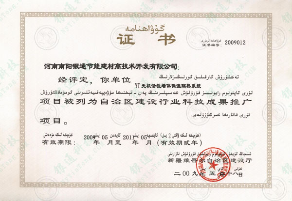 新疆省建筑節能產品核準證書 有效期限:2009年05月至2011年05月,有效期兩年