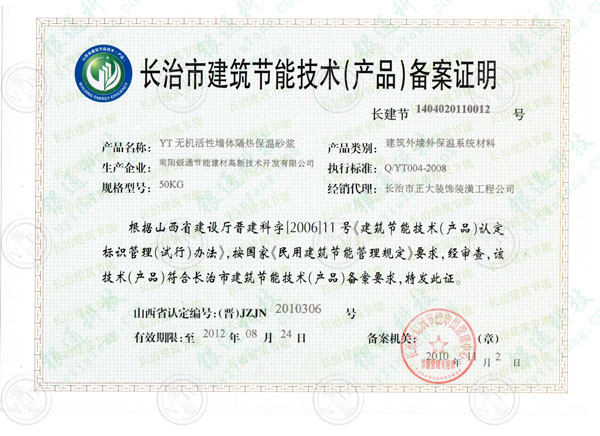 山西長治市建筑節能技術產品備案證明 長建節 1404020110012號 產品名稱yt無機活性墻體隔熱保溫砂漿 產品類型 建筑外墻外保溫系統材料 生產企業 南陽銀通節能建材高薪技術開發有限公司 執行標準 Q/YT2004-2008規格型號 50KG 根據山西省建設廳晉建科字【2006】11號建筑節能技術產品認定標識管理試行方法,按國家民用建筑節能管理規定要求,經審查 該技術產品符合長治市建筑節能技術產品備案要求 特發此證 山西省認定編號 晉JZJN2010306號 有效期限至2012年08月24日 備案機關 長治市建筑節能產品管理中心
