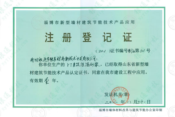 山東淄博市新型墻體建筑節能技術產品應用注冊登記證2011證書編號第521號 南陽銀通節能建材高新技術開發有限公司 你單位生產的yt建筑保溫砂漿 已經取得山東省新型墻材建筑節能技術產品認定證書 同意在我市建設工程中應用 有效期壹年 發證機關 淄博市墻體材料改革與建筑節能辦公室 二零零一八月三十一日