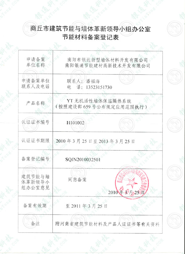 河南省商丘市建筑節能與墻體革新領導小組辦公室節能材料備案登記證 企業名稱 南陽銀通節能建材高新技術開發有限公司 南陽市銀達新型墻體材料開發有限公司 產品名稱YT無機活性墻體保溫隔熱系統 系統類別墻體保溫材料 認證編號省建設廳推廣證書編號H101002 河南省住房和城鄉建設廳認證發布文號 認定證書期限2010年3月25日到2013年3月25日 備案登記編號SQJN2010032501 建筑節能與墻體革新領導小組辦公室意見 同意備案 備案有效期至2011年3月25日 備注附河南省建筑節能材料及產品認定證書等有關資料 商丘市建筑節能與墻體革新領導小組辦公室