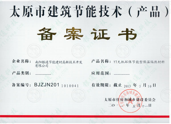 山西太原市建筑節能技術產品備案證書 企業名稱南陽銀通節能建材高新技術開發有限公司 產品名稱 YT無機活性墻體保溫隔熱材料 該產品已經通過建筑節能產品與新型墻體材料確認登記,備案編號:BJZJN201 1010041,有效期限截至至2013年5月,同意該產品在太原地區應用 太原市住房和城鄉建設委員會 2011年5月11日