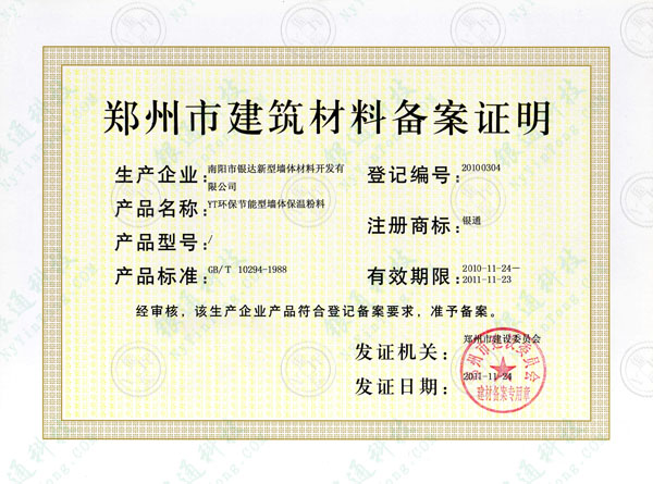 河南鄭州市建筑材料備案證明 南陽市銀達新型墻體材料開發有限公司 產品名稱YT無機活性墻體保溫隔熱系統 證書編號20100304 注冊商標銀通 有效期限至2011年11月23日 經審核該生產企業產品符合登記備案要求 準予備案 發證機關 鄭州市建設委員會 鄭州市建設委員會建材備案專用章