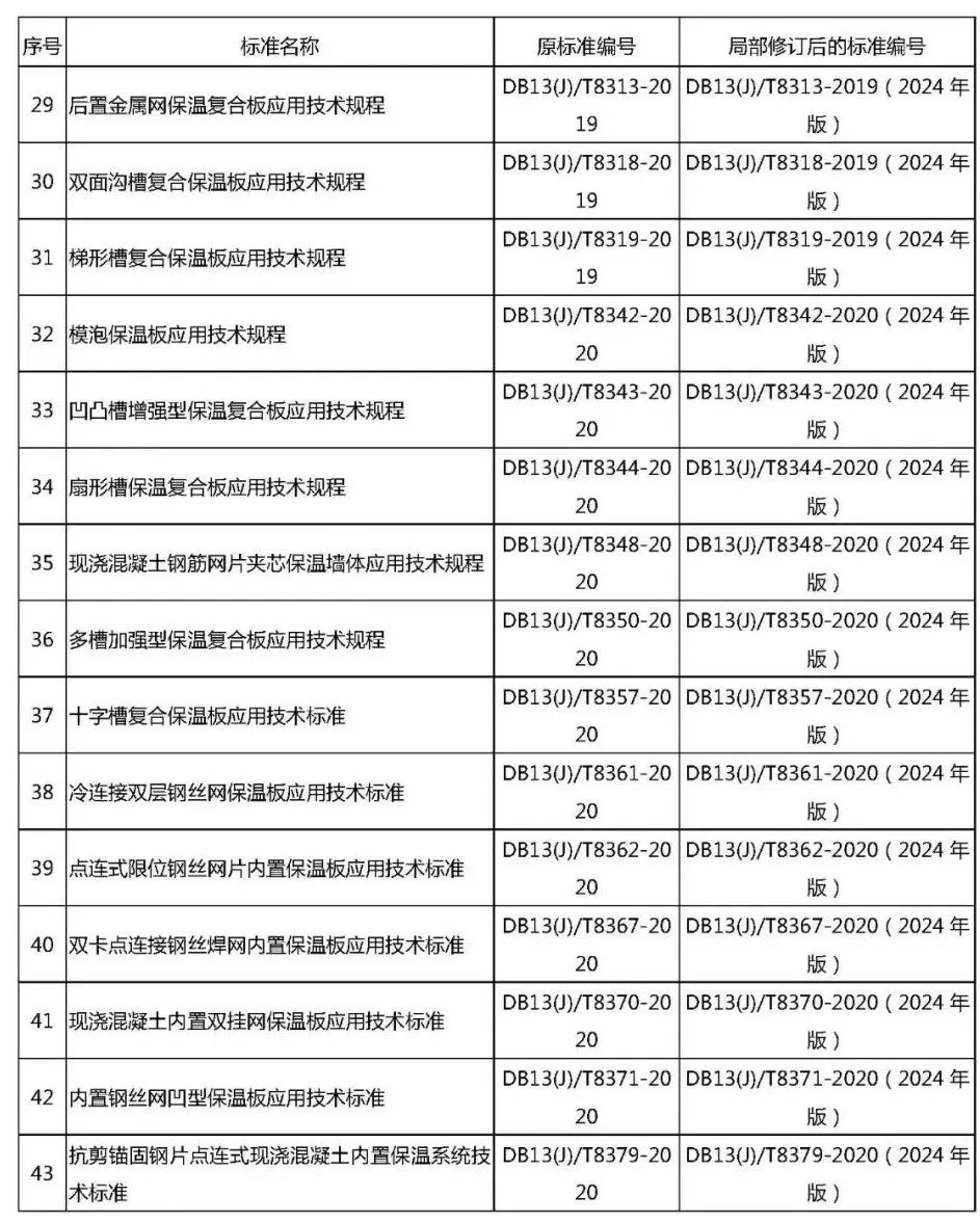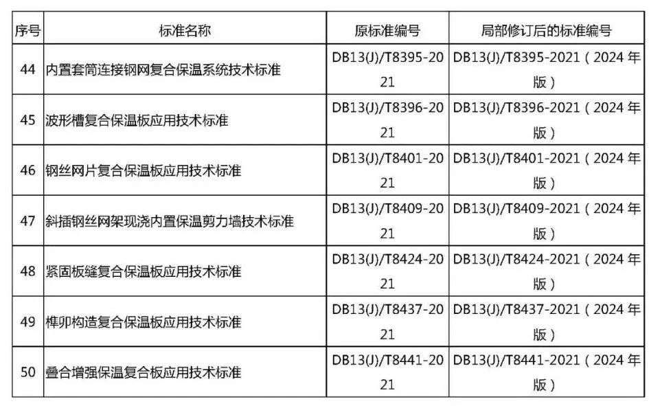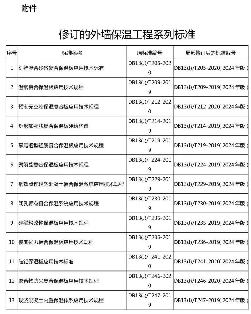根據現行國家強制性工程建設規范和《河北省民用建筑外墻外保溫工程統一技術措施》(冀建質安〔2021〕4號)的要求,對50項外墻保溫工程系列標準(見附件)進行了修訂。本次修訂的外墻保溫工程系列標準已經本機關審查并批準為河北省工程建設地方標準,現予發布,自2024年5月1日起實施,原標準同時廢止。